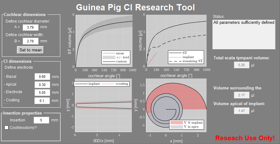 | User interface of the Guinea Pig Volume Model: On the left, the user can define the “cochlear dimensions” for computation of the individual ST volume, which is displayed relative to the mean profile ± 1 SD of the present study (top left graph). The tool also requires the “CI dimensions” and “Insertion properties”, based on which the array model is generated (bottom left graph) and the remaining perilymph volume inside the ST is computed (top and bottom right graphs). The corresponding volumes are displayed in the right column of the user interface.